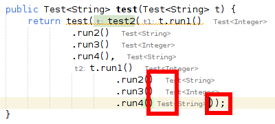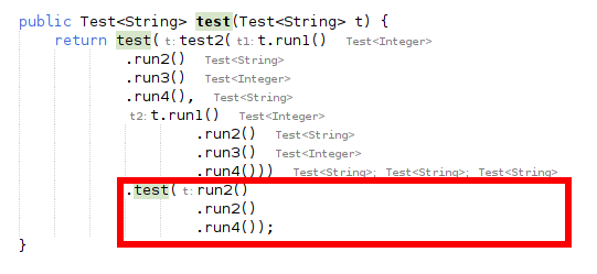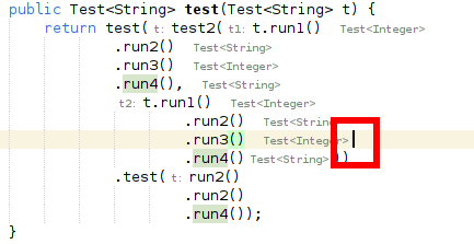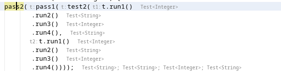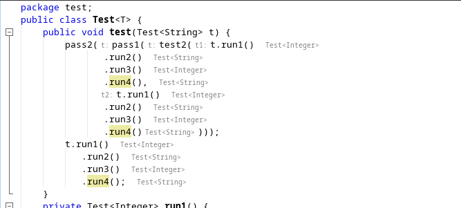 Thanks for the comment, @matthiasblaesing . I've tried to sketch putting the inline types after the braces (which, I think, also allows to eliminate some that are probably not so interesting, as they are not part of chained method invocation). I've put that here: What do you think? Thanks! |