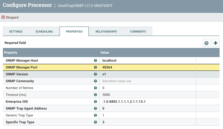 2022-05-20 14:23:37,376 ERROR [Timer-Driven Process Thread-9] o.a.nifi.snmp.processors.SendTrapSNMP SendTrapSNMP[id=e14c1a22-0180-1000-8d49-668bf9378c73] Processing halted: yielding [1 sec]