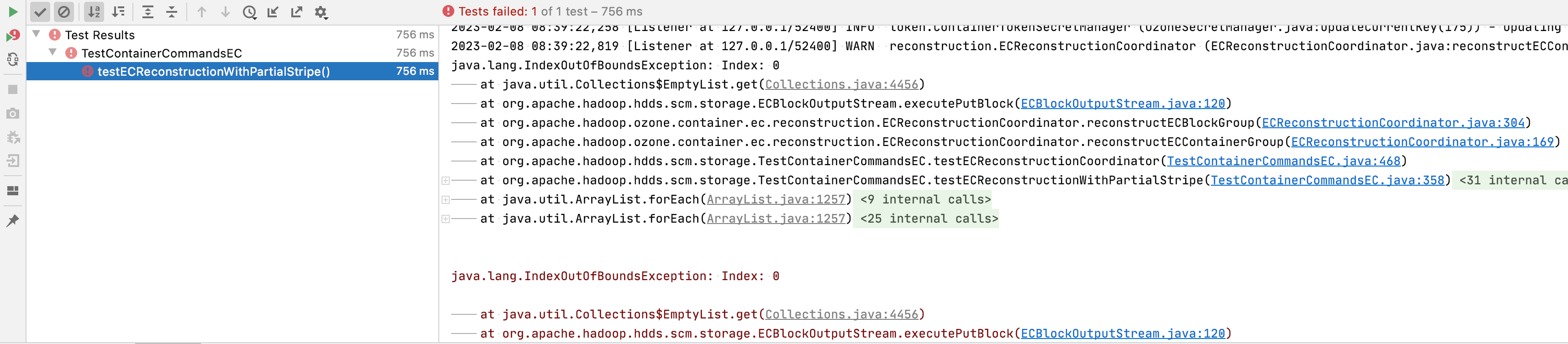 It is failing when I run this test. Interestingly I noticed that, when I run the tests together with testECReconstructionCoordinatorWithMissingIndexes135, it passes. Can you try running this test alone?