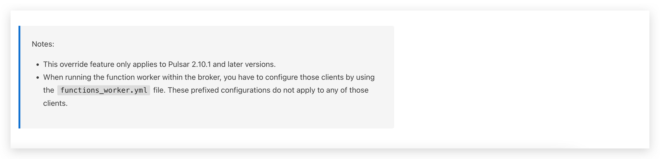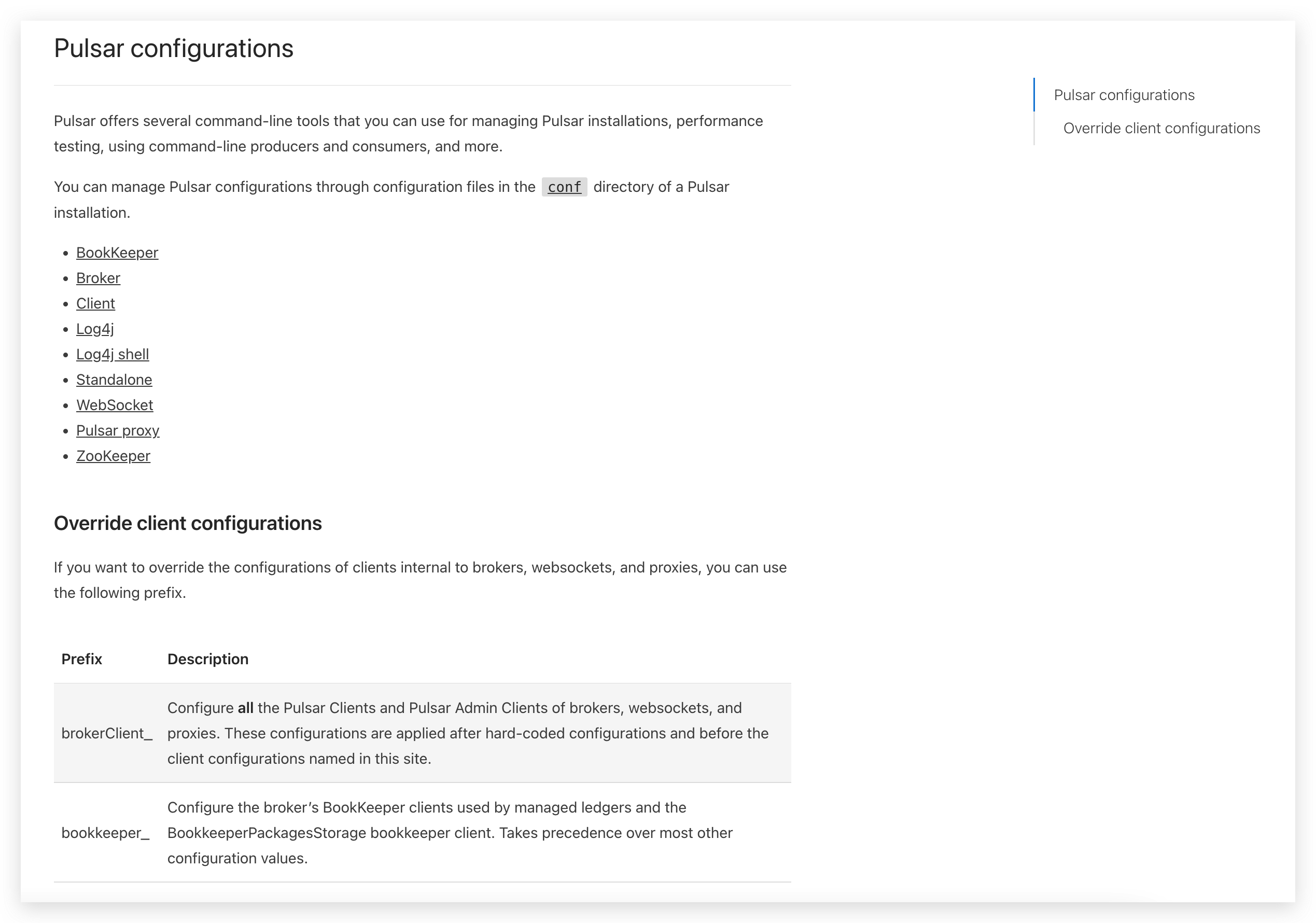 | |brokerClient_| Configure **all** the Pulsar Clients and Pulsar Admin Clients of brokers, websockets, and proxies. These configurations are applied after hard-coded configurations and before the client configurations named in this site.| | ||