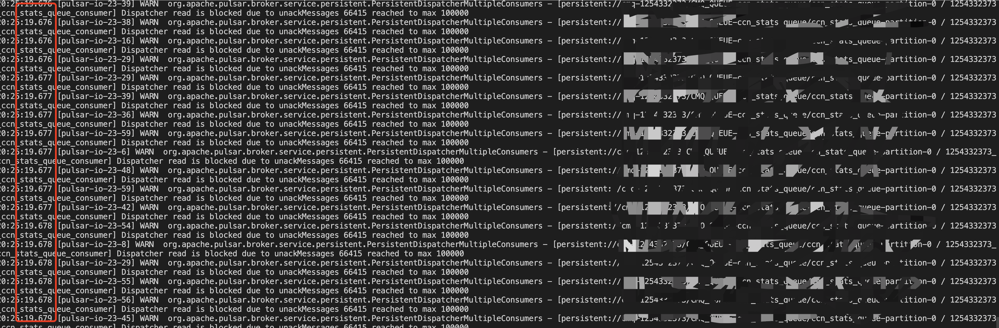 When unacked messages reached to max unacked messages, the following logs will be quickly output to the log file, causing the broker's log file to switch within a short period of time.