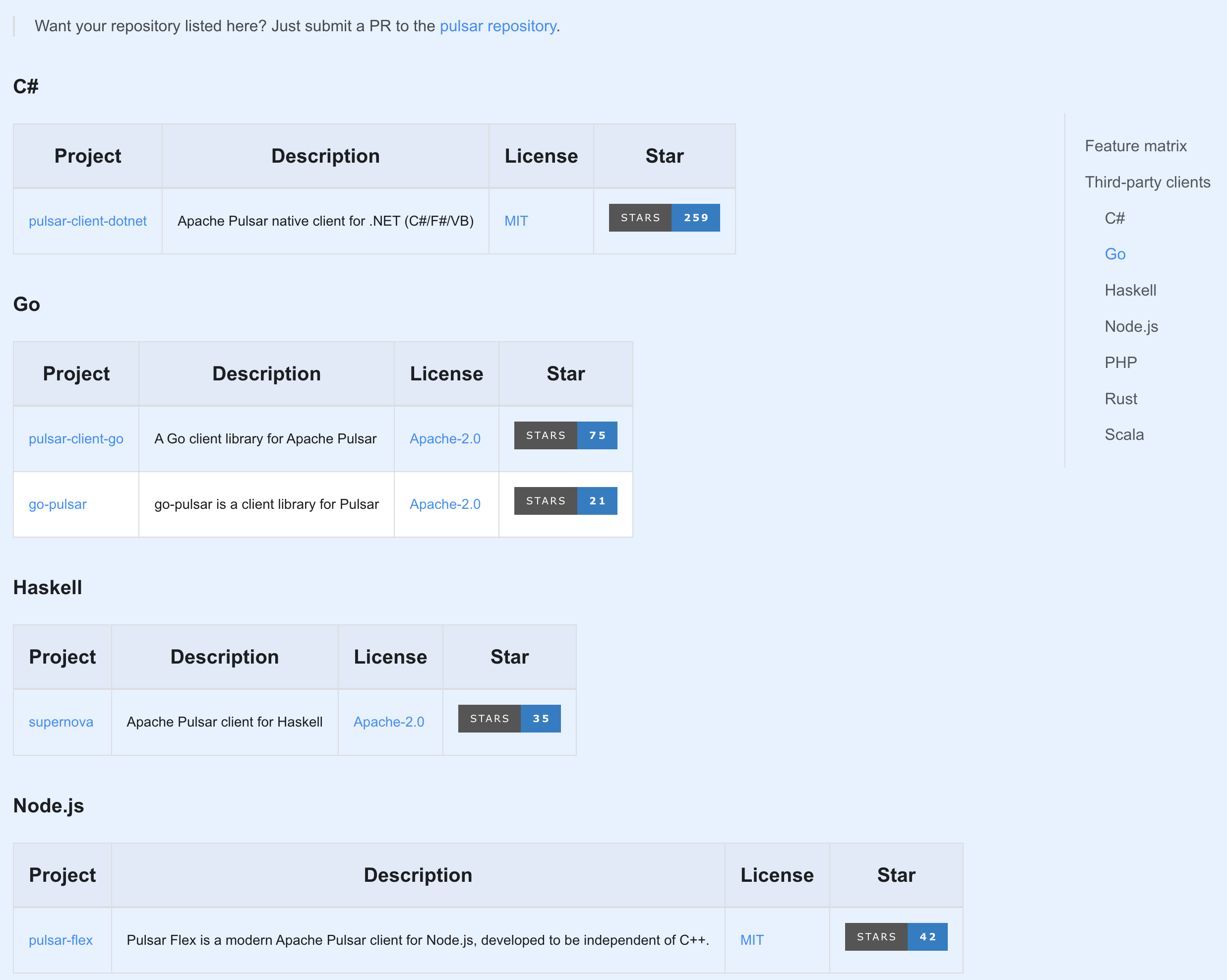 | Pulsar supports the following language-agnostic client libraries: | ||