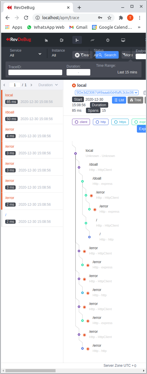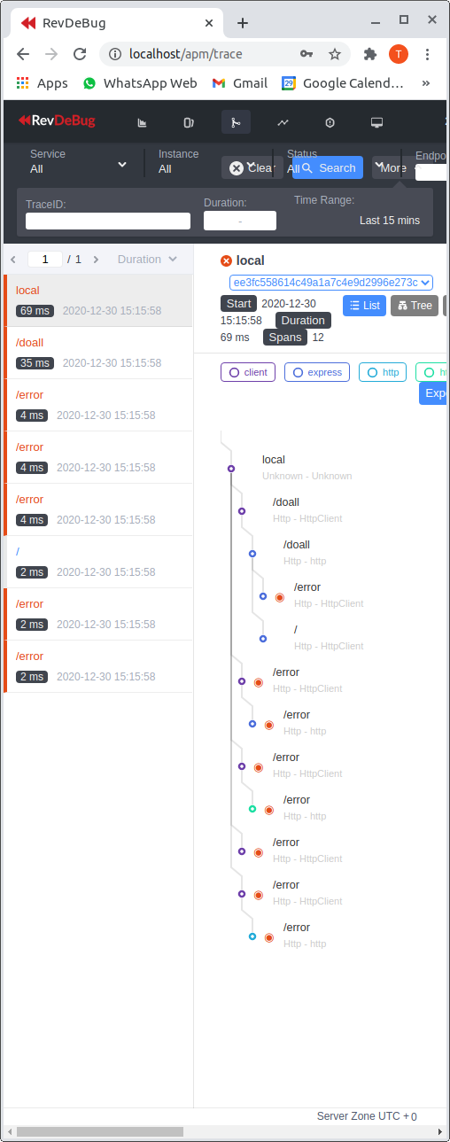 And here is after (broken, note entry span /doall marked as Http - http instead of Http - express and the exit spans cut off, as well as one of the standalone error exit spans also cut off):