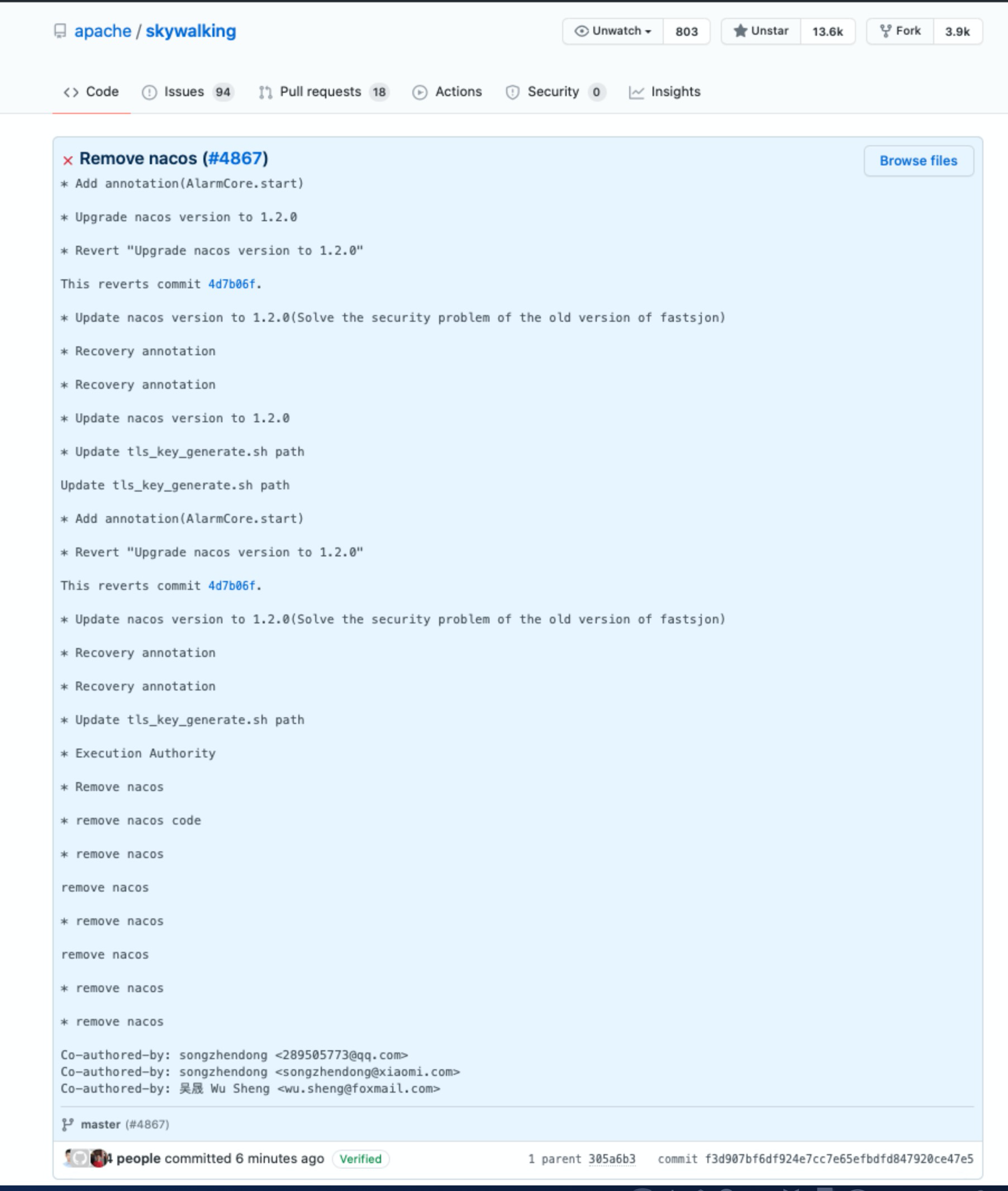 * Add annotation(AlarmCore.start) * Upgrade nacos version to 1.2.0 * Revert "Upgrade nacos version to 1.2.0" This reverts commit 4d7b06f. * Update nacos version to 1.2.0(Solve the security problem of the old version of fastsjon) * Recovery annotation * Recovery annotation * Update nacos version to 1.2.0 * Update tls_key_generate.sh path Update tls_key_generate.sh path * Add annotation(AlarmCore.start) * Revert "Upgrade nacos version to 1.2.0" This reverts commit 4d7b06f. * Update nacos version to 1.2.0(Solve the security problem of the old version of fastsjon) * Recovery annotation * Recovery annotation * Update tls_key_generate.sh path * Execution Authority * Remove nacos * remove nacos code * remove nacos remove nacos * remove nacos remove nacos * remove nacos * remove nacos Co-authored-by: songzhendong <289505773@qq.com> Co-authored-by: songzhendong <songzhendong@xiaomi.com> Co-authored-by: 吴晟 Wu Sheng <wu.sheng@foxmail.com>