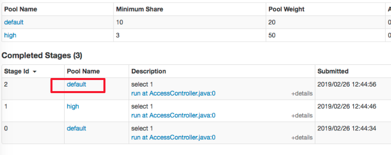 Because only the user submitted sql has set spark.sql.thriftserver.scheduler.pool=xxx, sessionToActivePool will put xxx value, will not be the default scheduler, so the default scheduler pool name is null