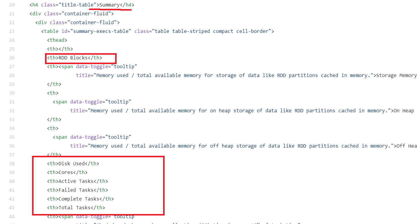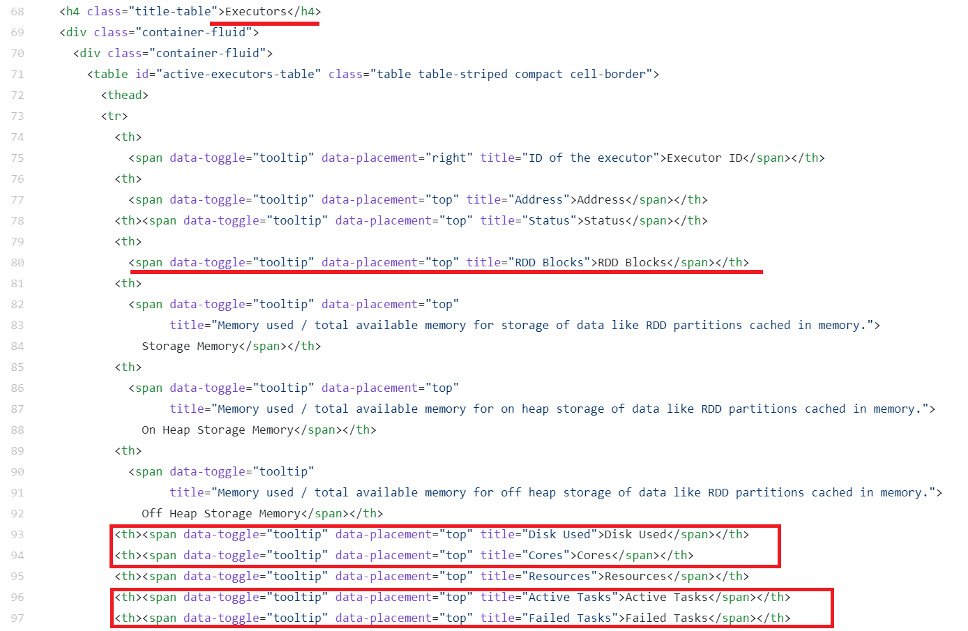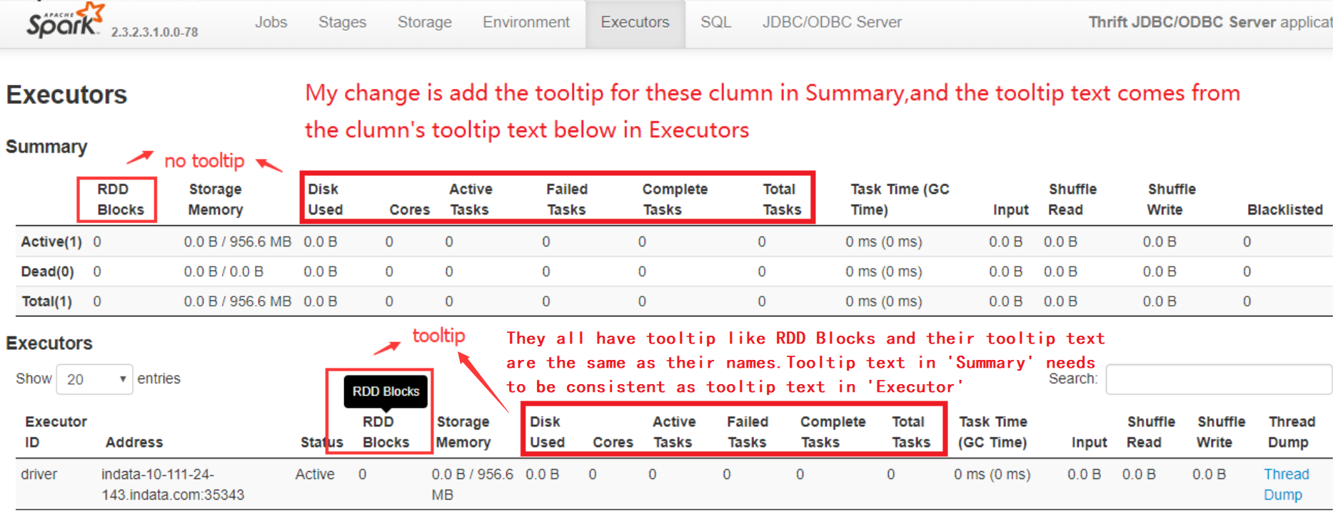 Shuffle Write and Blacklisted, but there are still some list names that have not tooltip. They are RDD Blocks, Disk Used,Cores, Activity Tasks, Failed Tasks , Complete Tasks and Total Tasks. oddly, Executors section below,All the column names Contains the column names above have tooltip .