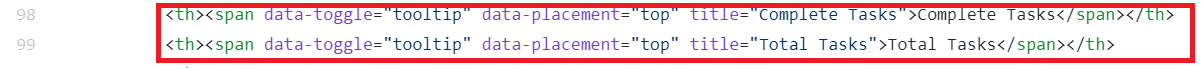 | <th><span data-toggle="tooltip" data-placement="top" title="Failed Tasks show in shaded red. Color opacity reach max at 10% of Total Tasks.">Failed Tasks</span></th> |