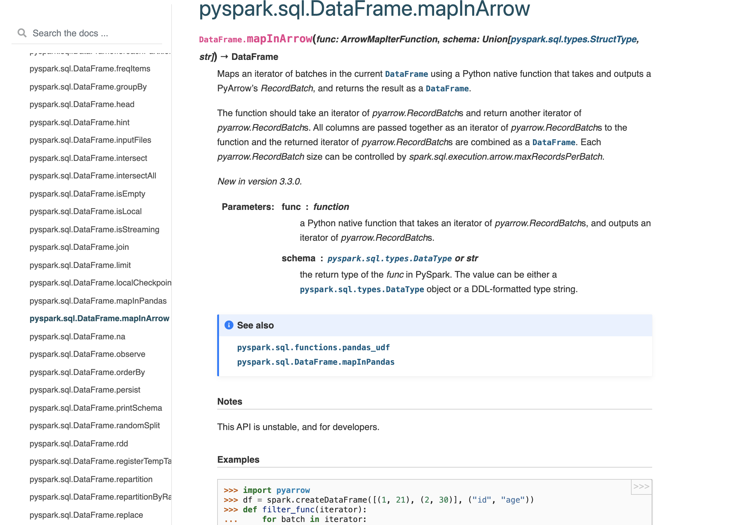 DataFrame.mapInPandas(#25025) but decided to don't publicly document like that because this is an unstable developer API.Why are the changes needed?