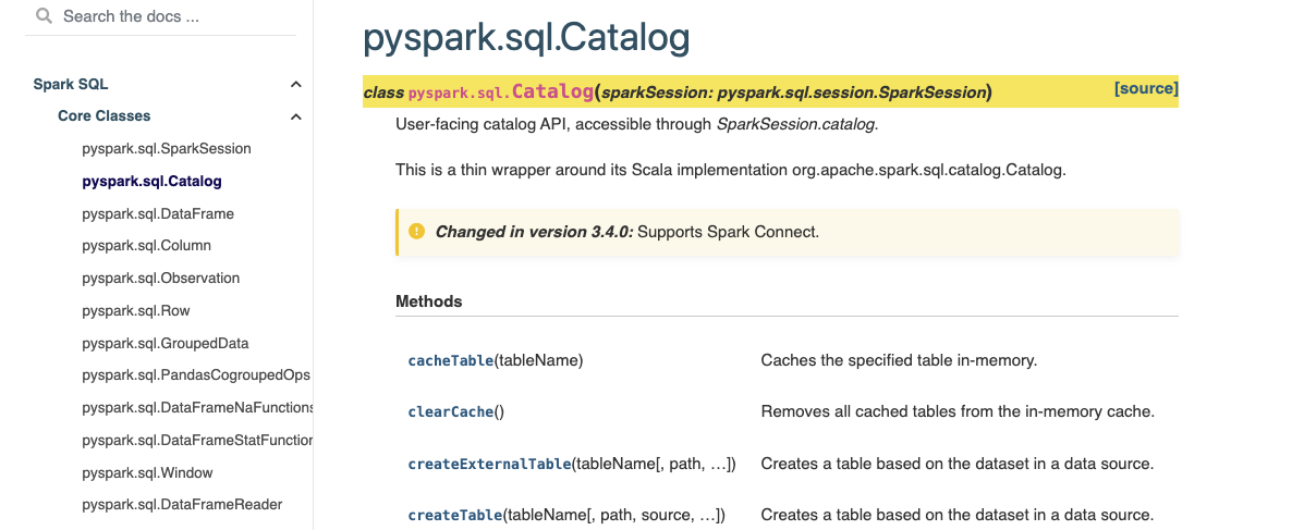 …n Catalog ### What changes were proposed in this pull request? This PR proposes to deduplicate versionchanged directive in Catalog. ### Why are the changes needed? All API is implemented so we don't need to mark individual method. ### Does this PR introduce _any_ user-facing change? Yes, it changes the documentation. ### How was this patch tested? Manually check with documentation build. CI in this PR should test it out too.  Closes #40670 from HyukjinKwon/minor-doc-catalog. Authored-by: Hyukjin Kwon <gurwls223@apache.org> Signed-off-by: Hyukjin Kwon <gurwls223@apache.org> (cherry picked from commit b86d90d) Signed-off-by: Hyukjin Kwon <gurwls223@apache.org>