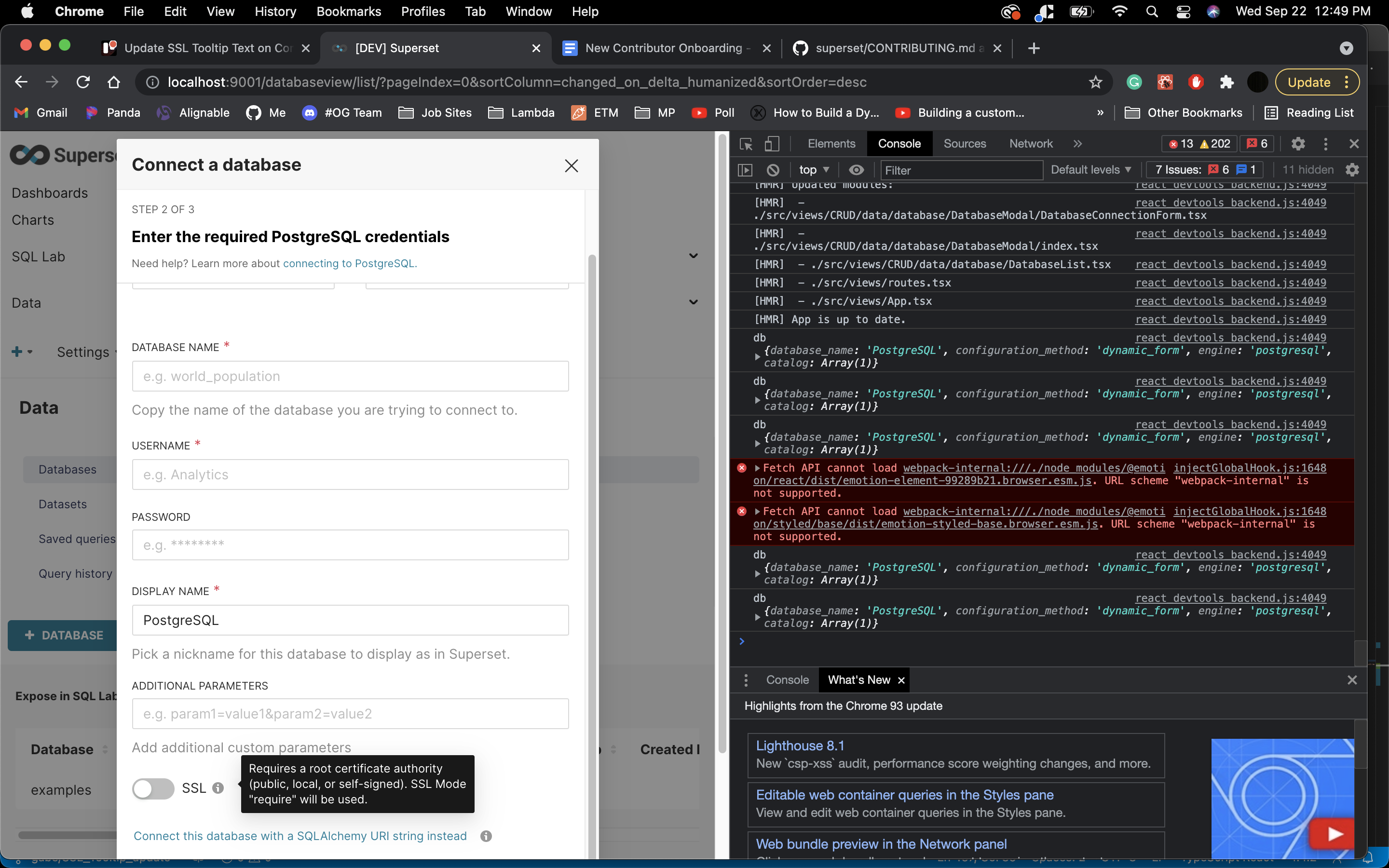Changed the SSL tooltip text to updated based on the database the user selects.