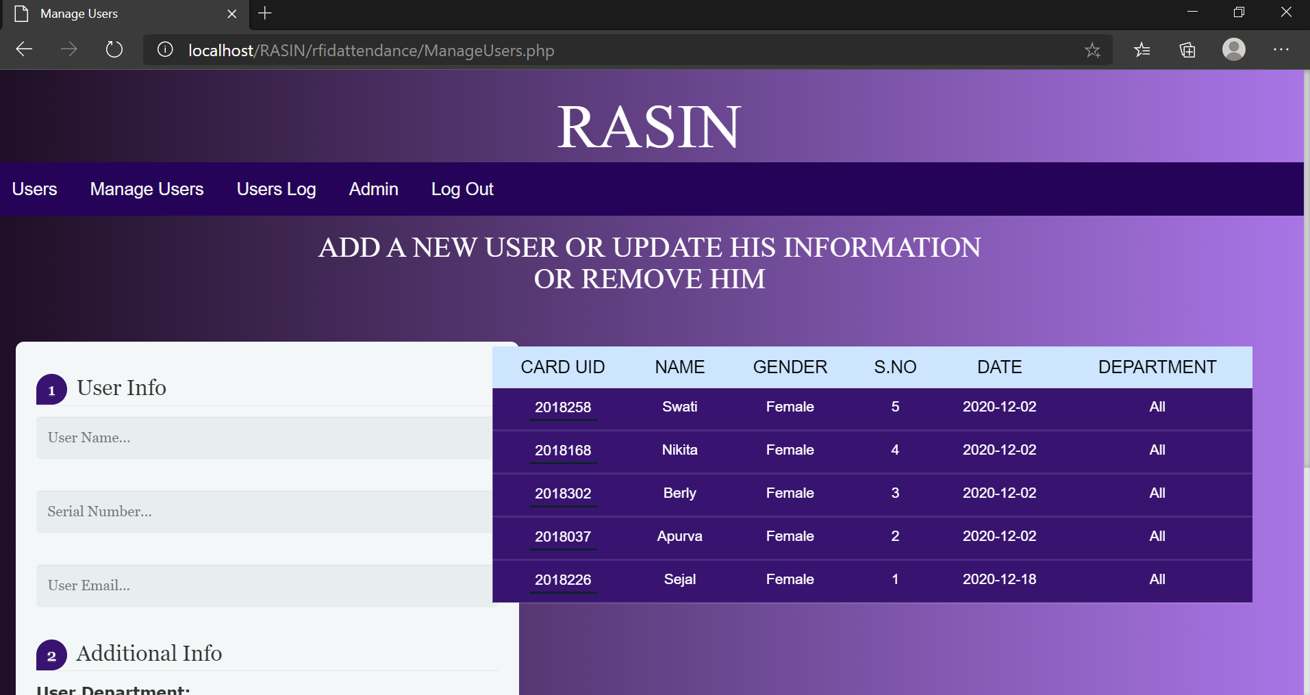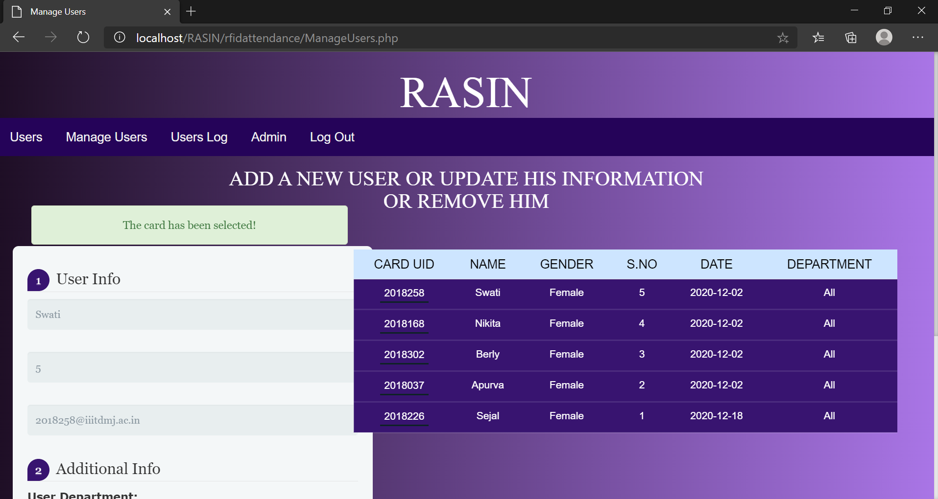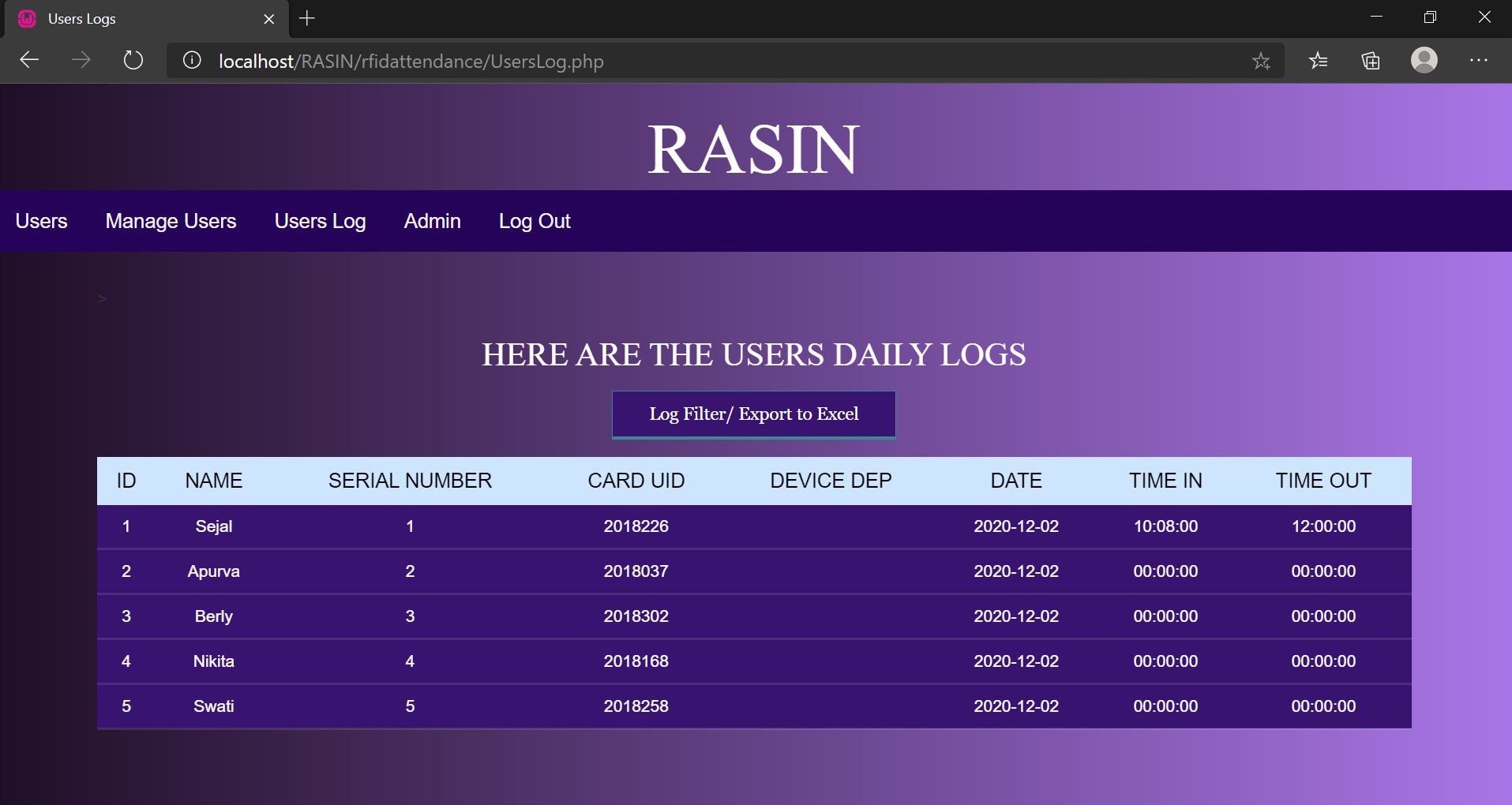 USERS LOGS DISPLAYING TIME WHEN STUDENT ENTERED AND LEFT CLASS AS STUDENT SCANS THE CARD: