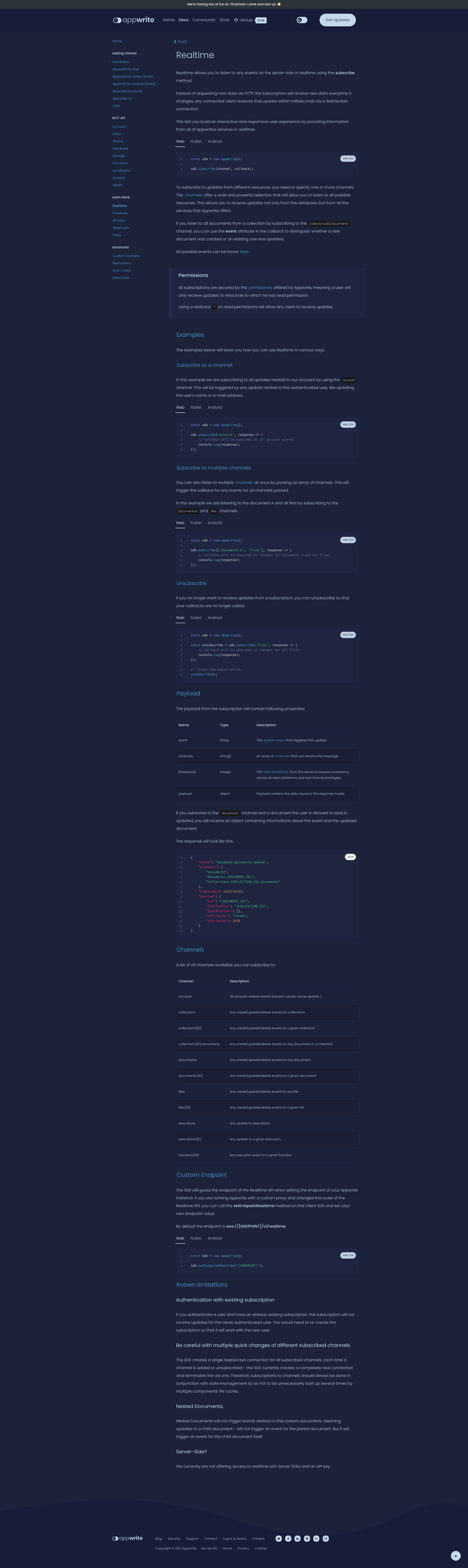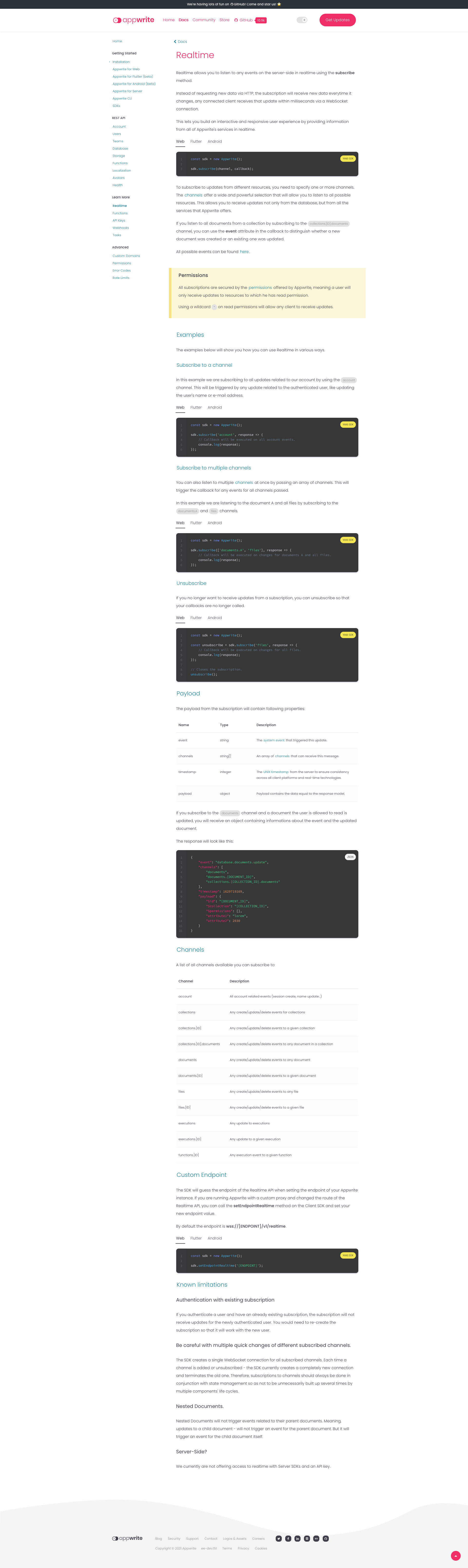 | <p>All subscriptions are secured by the <a href="/docs/permissions">permissions</a> offered by Appwrite, meaning a user will only receive updates to resources to which he has read permission.</p> | ||