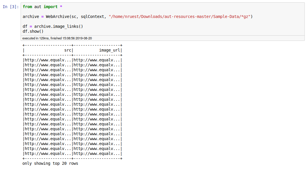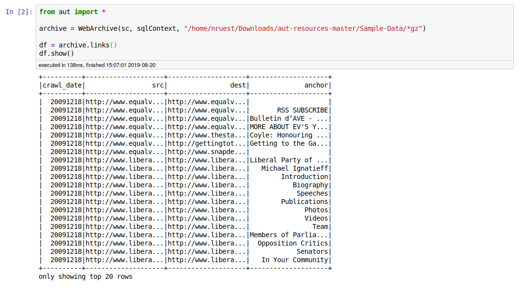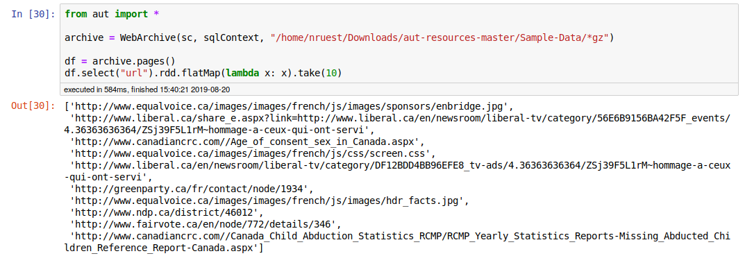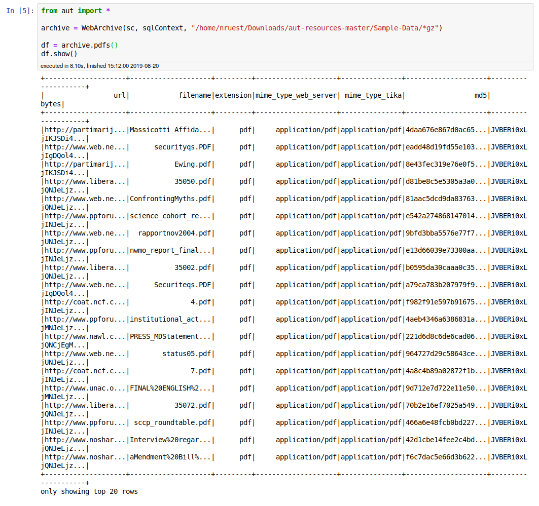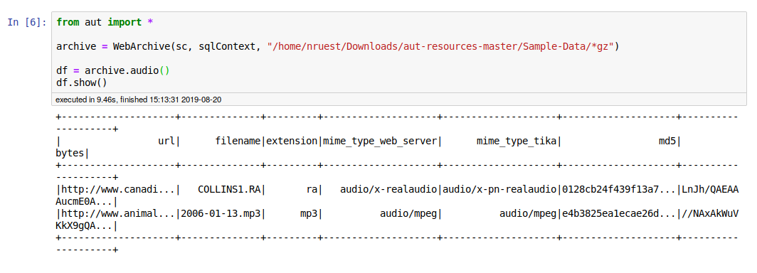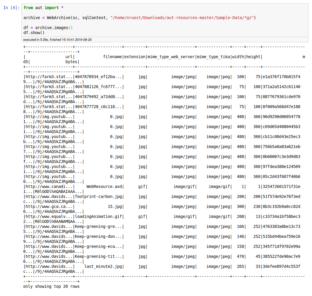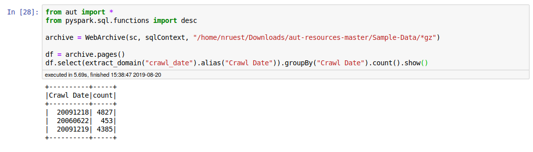 spark-submit --jars /path/to/aut-0.18.0-fatjar.jar --driver-class-path /path/to/aut-0.18.0-fatjar.jar --py-files /path/to/aut-0.18.0.zip /path/to/custom/python/file.pyAn easier method is to use the interactive, browser-based Jupyter Notebooks to work with the Archives Unleashed Toolkit (AUT). You can see it in action below.