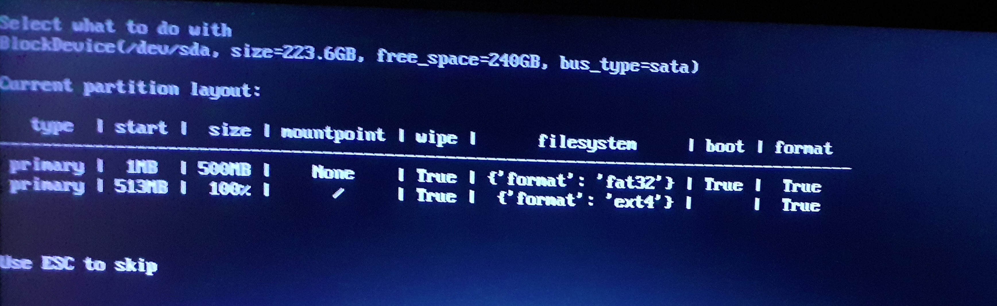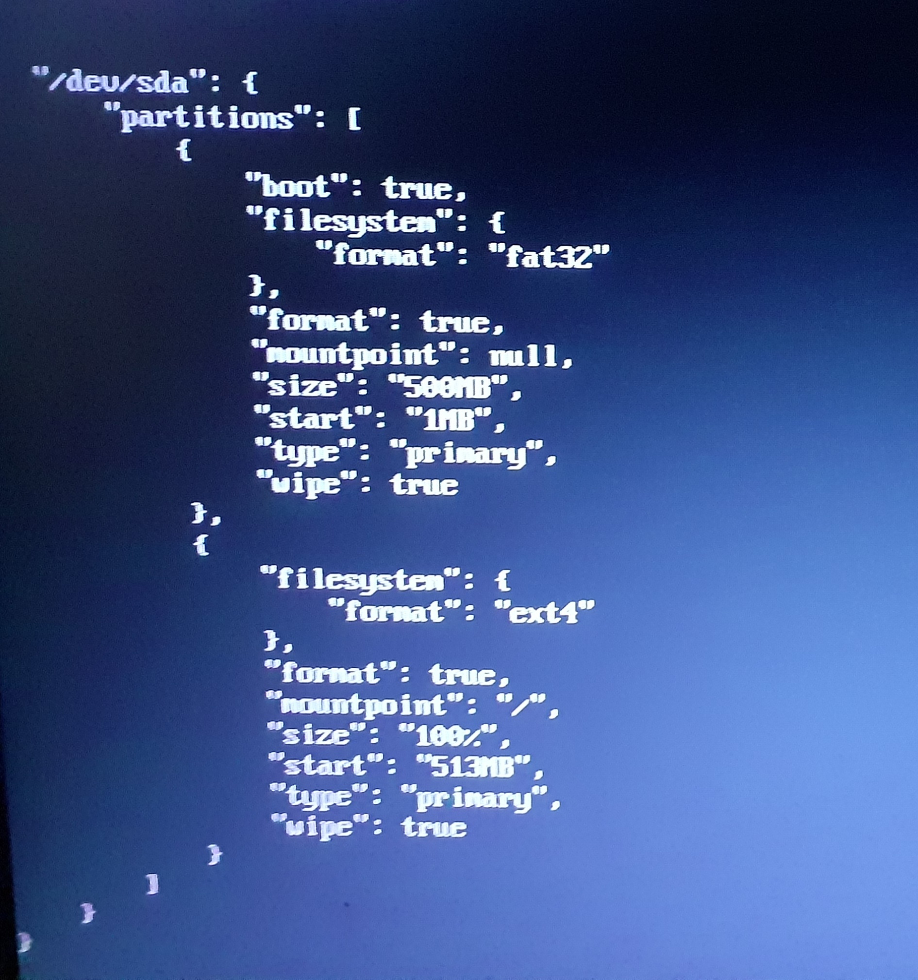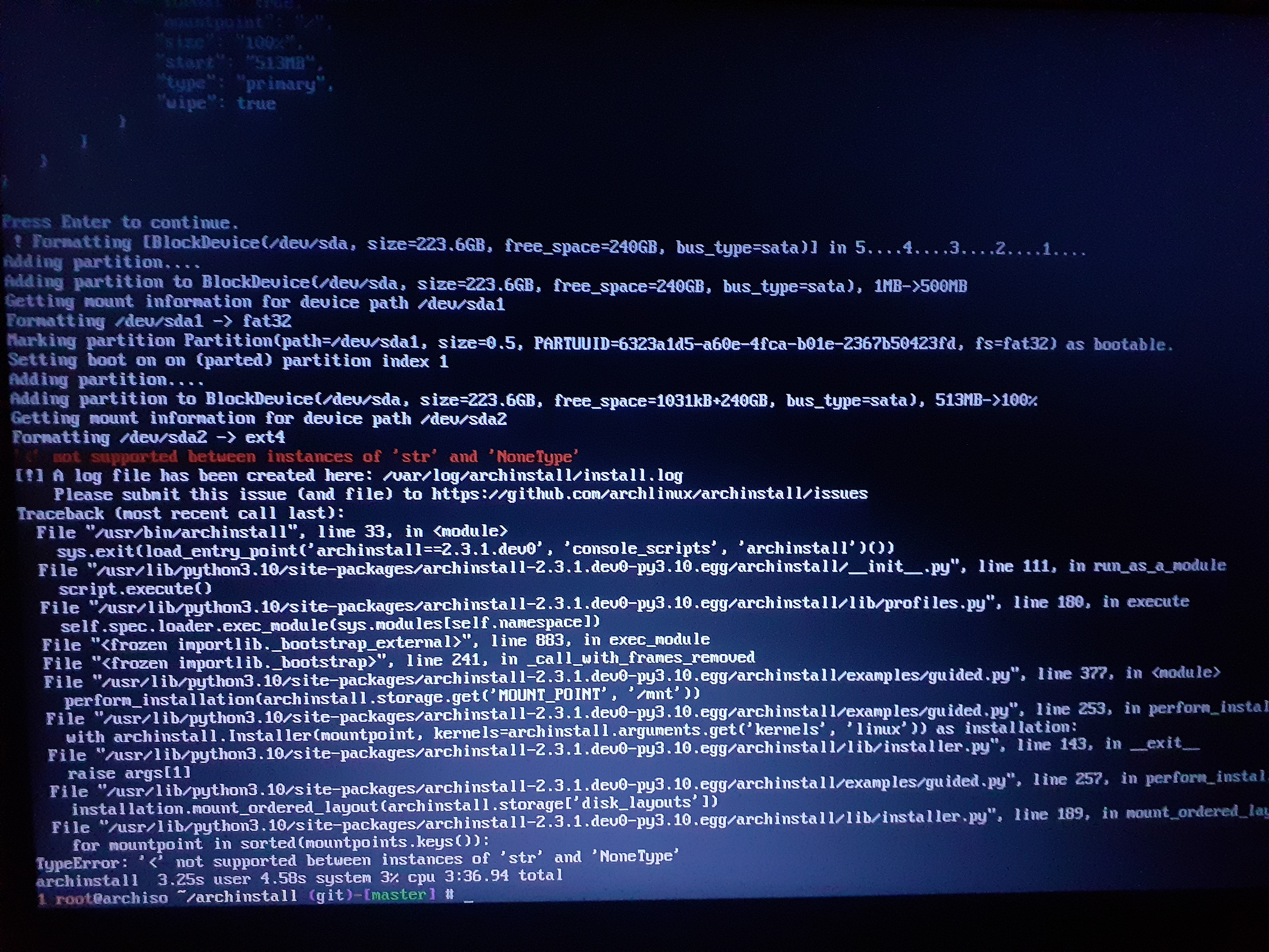 I tried to do manual partitioning, as automatic partitioning doesn't offer an option to not create the "home" partition. And it was like this:   However, when formatting the partitions this error occurred: