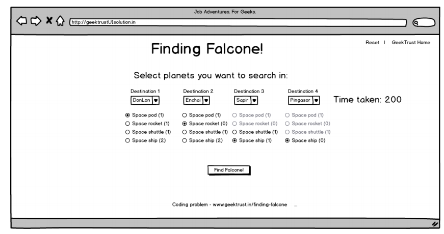 I have build a UI through which King Shan can • select 4 planets to search (out of the total 6) • select which space vehicles to send to these planets • see how much time it will take for the vehicles to reach their targets & • show final result of success or failure