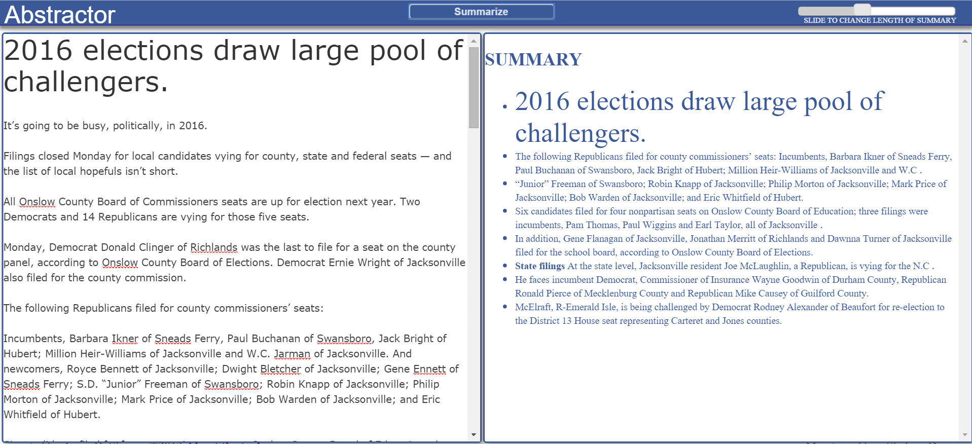 TIP to use the tool: While copying the content to be summarized into the document-input window, try to remove irrelevant or unwanted content(like advertisments) from the input. Also, one ssould be careful in maintaining the document structure and style as of the original document. All such modifications might improve the results drastically.