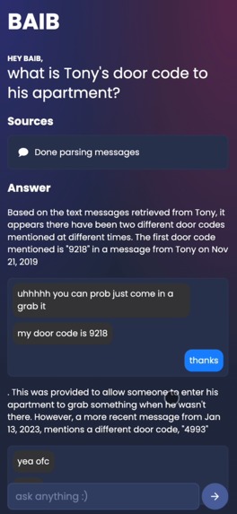 BAIB (pronounced "babe") is designed to seamlessly answer natural language queries about your life. BAIB builds an index of your personal data — text messages, emails, photos, among others — and runs a search pipeline on top of that data to answer questions.