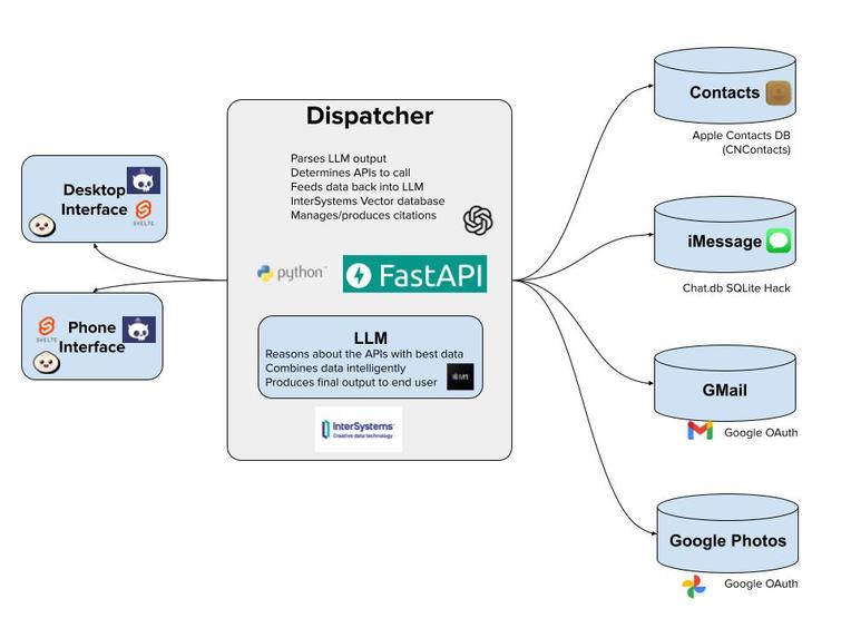 Python backend. Our backend is built in Python with FastAPI, using a few hacks (check out our GitHub) to connect to your Mac’s contacts and iMessage database. We use the Google API to connect to Gmail + photos.