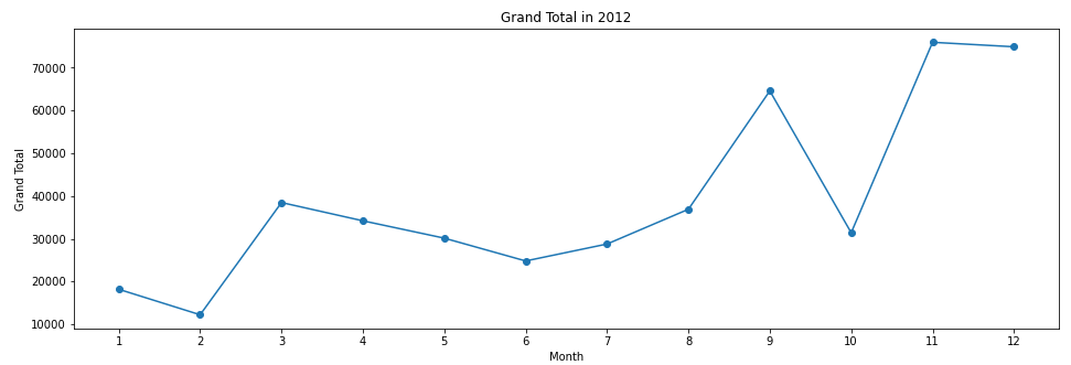 - How much is the grand total per month in each year and which month has the highest and lowest grand total in each year?