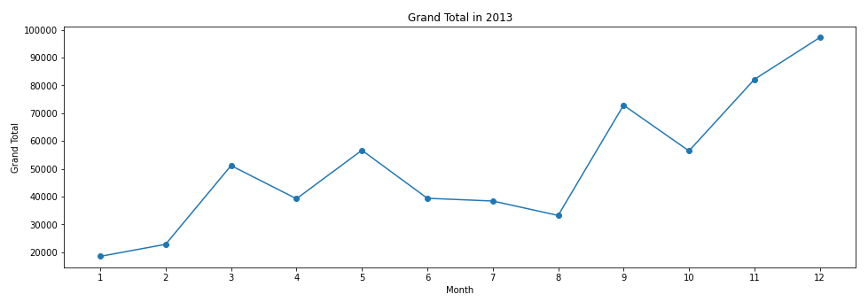 Based on the graph above, January is the month with the lowest grand total of 3%, while December is the month with the highest grand total of 16%. 2013 started with a relatively low grand total, amounting to only 3% in January, then in February it increased to 3.8% and in March it increased to 8.4%. In April it decreased to 6.5% and in March it increased again to 9.3%. It then fell in June to 6.5%. The highest grand total in the first half was in May with a percentage of 9.3%. Entering the second half of 2013, the grand total for July and August did not differ significantly, in July it was 6.3% and in August it was 5.5%. In the following month or September, there was a significant increase in the grand total of up to 12%. sales tend to increase at the end of the year, in November by 14% and in December by 16%. -