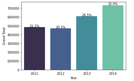 In the chart above shows the grand total by year, we can conclude that the lowest grand total was in 2012 at 20.5%, while the highest grand total was in 2014 at 32%. Although there was a decrease in total sales in 2012 from 0.6% in 2011, but in 2013 and 2014 there was an increase. It can be seen starting from 2011 with a grand total of 21%. In 2012 total sales decreased by 0.6% so that total sales were 20%, in 2013 the grand total here increased by 5.1% so that total sales were 26.5%, while in 2014 it increased by 5.5% so that total sales were by 32%.