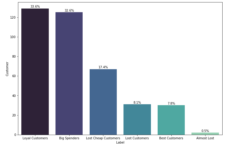 The spread of Best Customers is only 7.8%, there needs to be a way for these customers to remain loyal and try to include customers in the Loyal Customers and Big Spender categories to become best customers. In addition, to listen to feedback from them is also important.