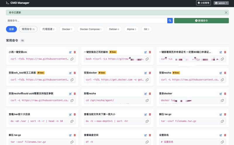 Cmd Manager 是一个轻量级、私有化的命令管理工具。你可以在现代化的 Web 界面上录入、分组、排序你的常用 Shell 命令,然后通过一行代码在任何服务器(小鸡)上唤出交互式菜单,实现命令的一键复制或直接执行。
