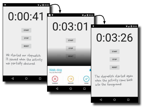 Activities form the foundation of every Android app. So far you’ve seen how to create activities, and made one activity start another using an intent. But what’s really going on beneath the hood? In this chapter we’re going to dig a little deeper into the activity lifecycle. What happens when an activity is created and destroyed? Which methods get called when an activity is made visible and appears in the foreground, and which get called when the activity loses the focus and is hidden? And how do you save and restore your activity’s state?