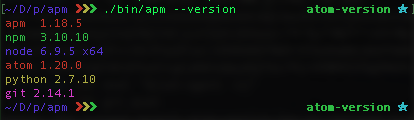 ~/D/p/apm ❯❯❯ apm --version                                                                                                                                                                    atom-version