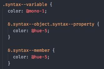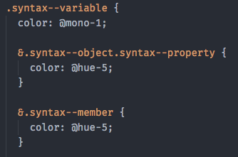 Yeah I think these would break a lot of things. Having a guide/convention both for scopes that grammars should apply and how they should be colored in relation to each other would be nice to have. Scopes seem to be kinda standard for every core grammar, maybe it's because that's how they get colored or maybe there is some convention already that I don't know about. But there are some differences. For example php has a whole lot of red with one-dark because it decided to scope local variables as In the WIP pr to add a tree-sitter php grammar I have currently removed this local variable scope but I am considering adding it back as with a different class that is not colored by one-syntax.