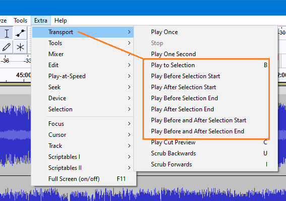 I suspect that they are not very useful to most normally sighted users - especially since they are (rightly, in my view) hidden away in the normally not exposed Extra menu. I, for one certainly never use them. But I thought that the fundamental purpose of the Extra menu that @JamesCrook was to provide a set of commands for VI/unsighted users so that thy could access them via assigning keyboard shortcuts to the ones they needed most as well as access to the Extra>Transport>Play... commands in the menu via screen readers. |