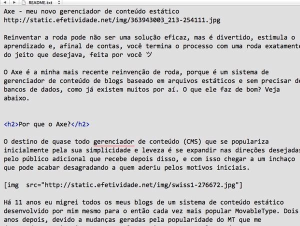 O Axe é a minha mais recente reinvenção de roda, porque é um sistema de gerenciador de conteúdo de blogs baseado em arquivos estáticos e sem precisar de bancos de dados, como já existem muitos por aí. O que ele faz de bom? Veja nos links abaixo: