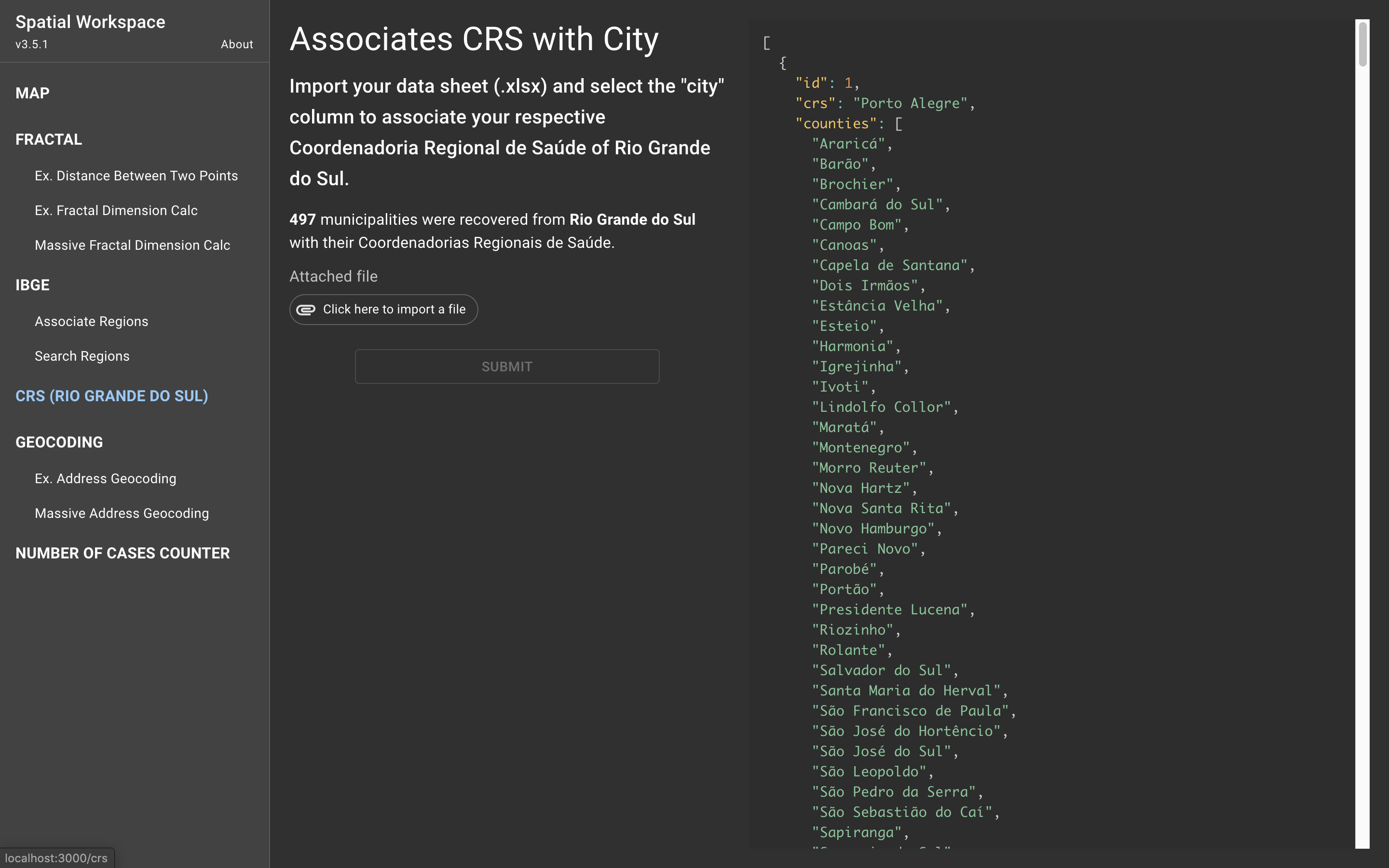 Nesta interface é possível associar as Coordenadorias Regionais de Saúde do Rio Grande do Sul às cidades do seu conjunto de dados. Para realizar a associação é necessário anexar um arquivo de dados .xlsx e selecionar a coluna que representa a cidade dos seus registros. Clicando no botão “submit” é feito o download de um arquivo .xlsx com a associação realizada.