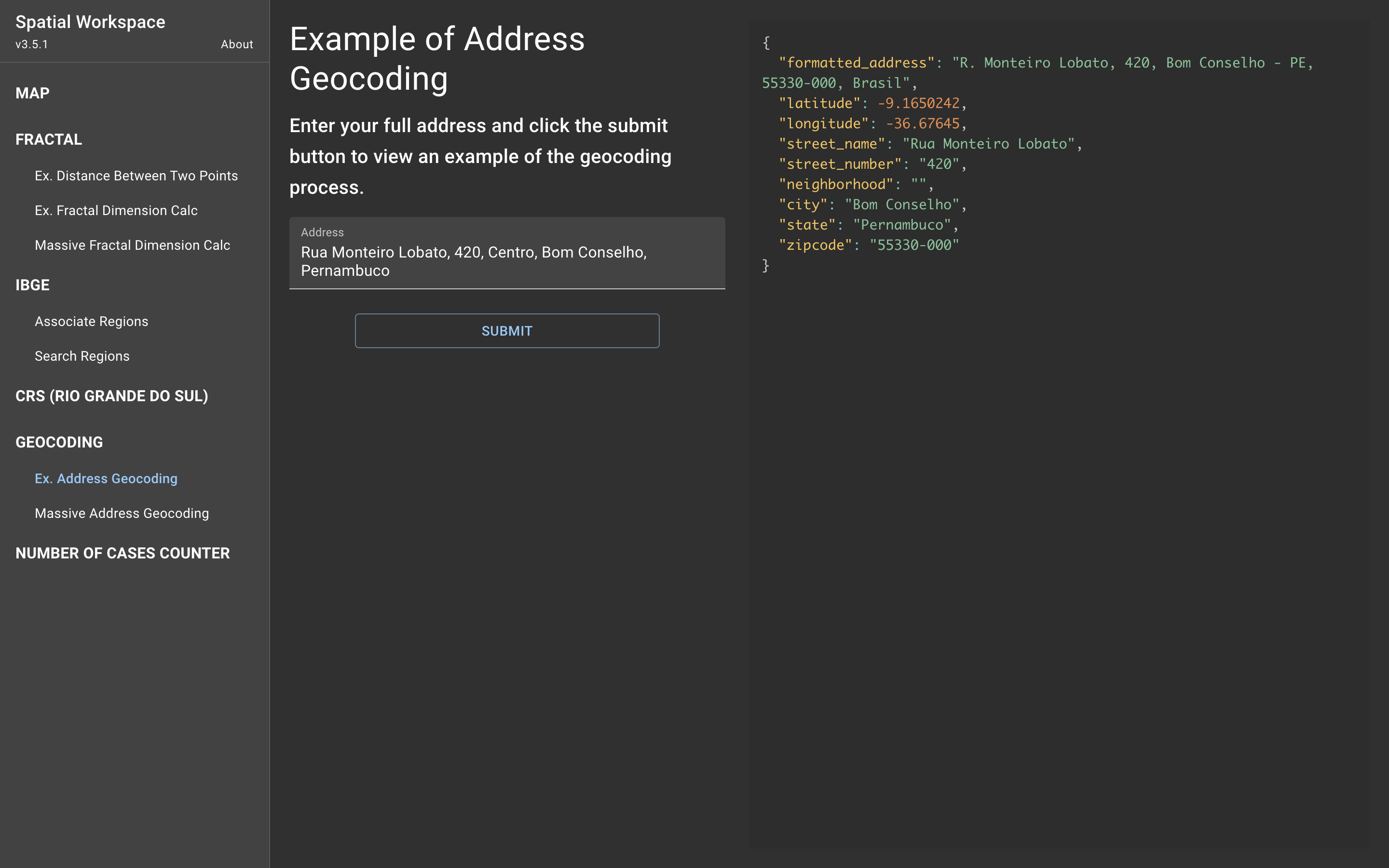 Esta interface exemplifica o georreferenciamento de um registro. Para realizar o georreferenciamento é necessário o endereço completo de uma localidade. Ao digitar o endereço e clicar no botão "submit" é enviada uma requisição ao serviço de Geocodificação do Google Maps API. Os dados retornados da API são tratados localmente e apresentados ao usuários de forma organizada na seguinte estrutura: endereço formatado, latitude, longitude, nome da rua, número da casa, bairro, cidade, estado e cep.