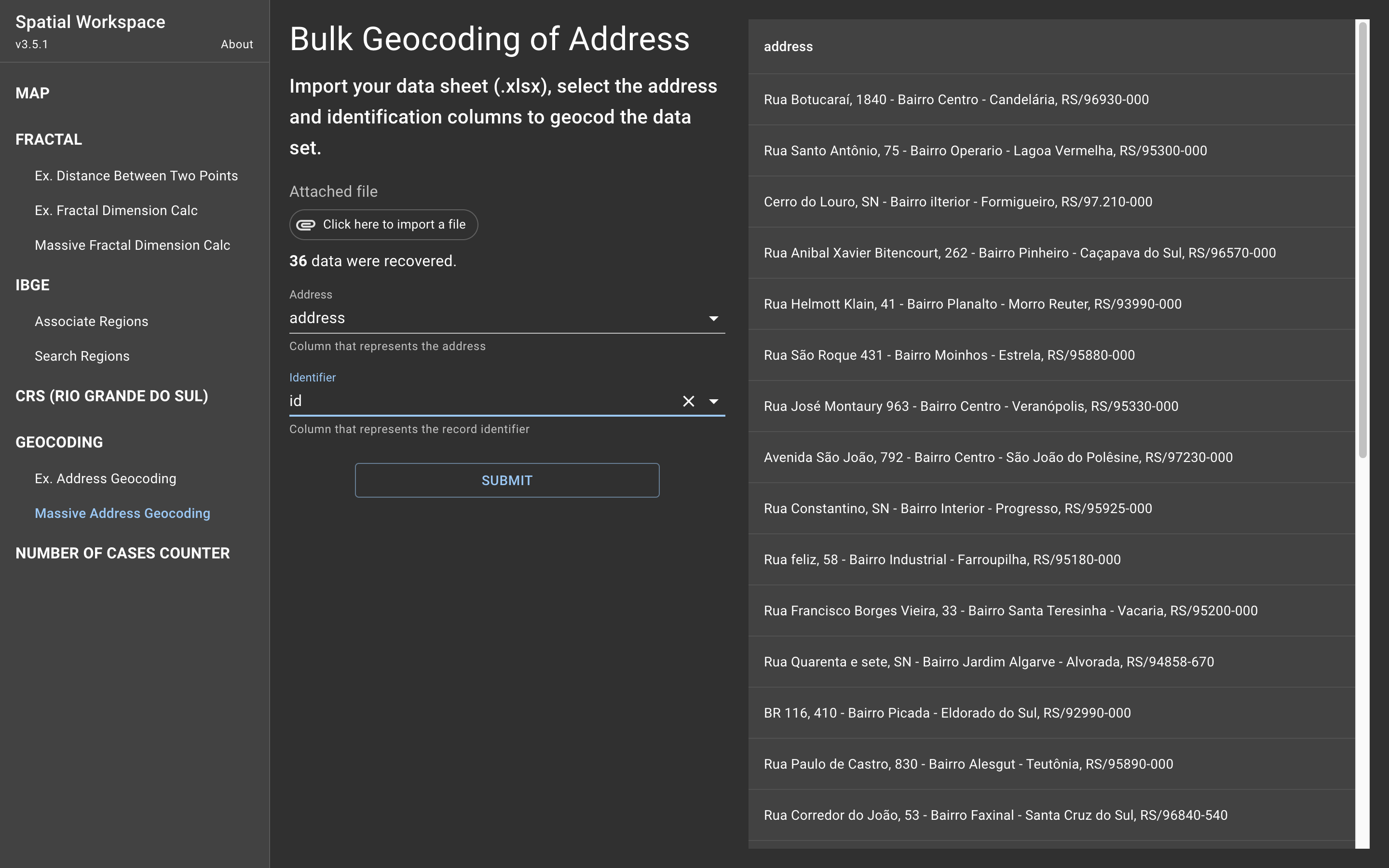 Nesta interface é possível realizar o georreferenciamento em massa de registros. Para realizar o georreferenciamento é necessário anexar um arquivo de dados .xlsx, selecionar a coluna que representa o endereço dos registros e selecionar a coluna que identifica os registros (esta coluna tem por finalidade a organização dos registros). Ao clicar no botão "submit", o georreferenciamento dos registros será iniciado. Após o termino, automaticamente será realizado o download de um arquivo .xslx com os registros georreferenciados. No arquivo .xslx haverá 2 folhas, uma com os registros que possivelmente obtiveram falha no georreferenciamento e outra folha com os registros que obtiveram sucesso.