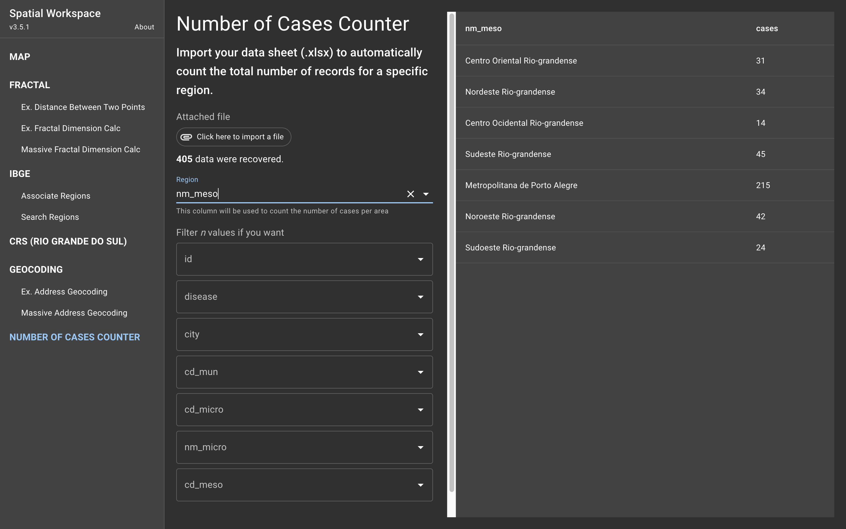 Nesta interface é possível calcular a dimensão fractal de um conjunto de dados georreferenciados. Para calcular a dimensão fractal você deve anexar um arquivo de dados .xslx e selecionar as colunas que representam as coordenadas geográficas (lat & lng). Após isso você deve escolher uma área de interesse para que o cálculo possa ser realizado de modo comparativo entre as áreas. Também, é possível realizar um filtro sobre os dados, exemplo: registros de uma determinada raça ou doença. Dinamicamente é calculada a dimensão fractal e apresentada na tabela ao lado. Variações entre a distância dos eventos pode ser realiza no input slide. Clicando no botão "submit" é possível realizar o download das informações apresentadas na tabela.