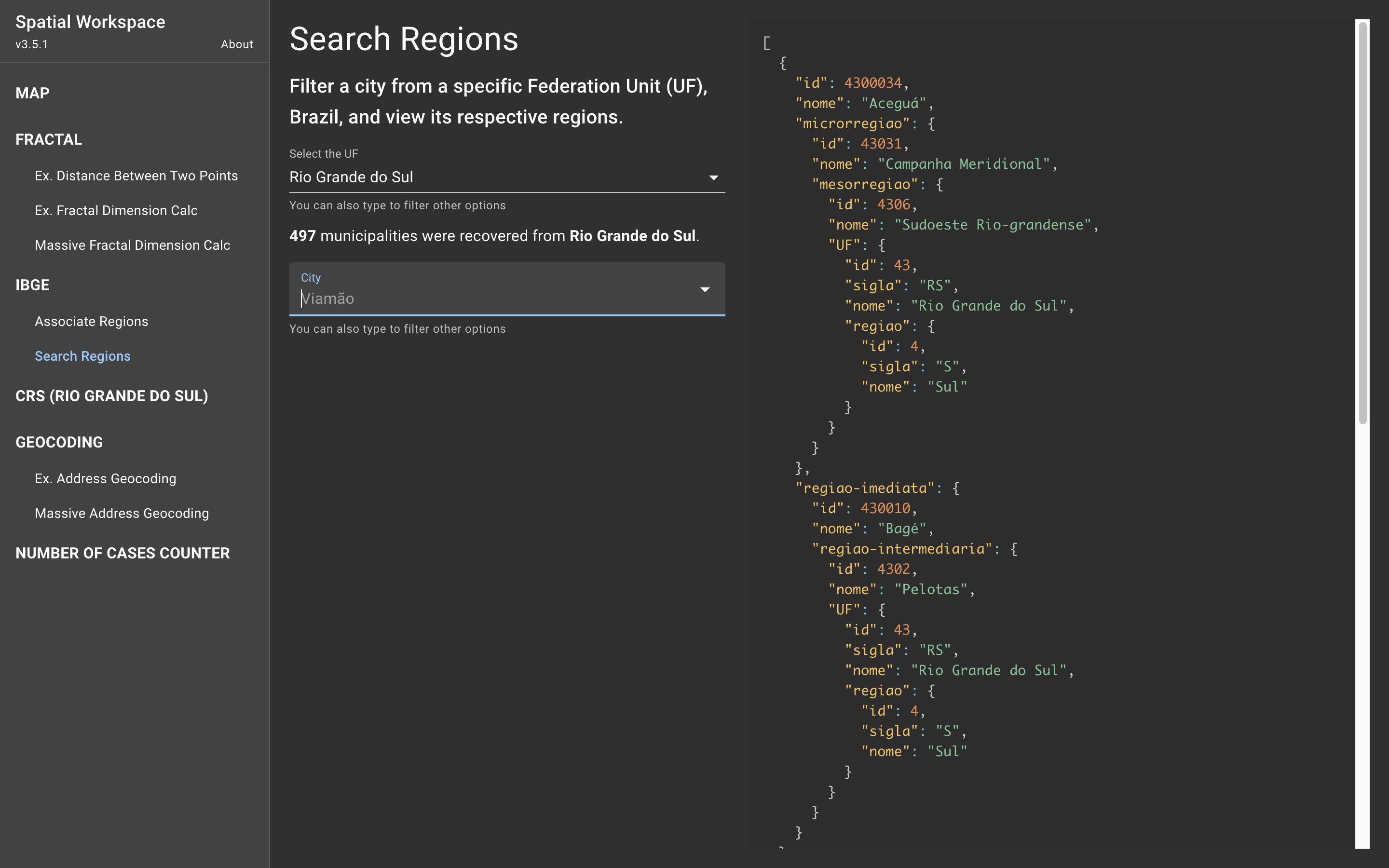 Nesta interface é possível filtrar cidades de uma Unidade Federativa (UF) específica e visualizar suas regiões.
