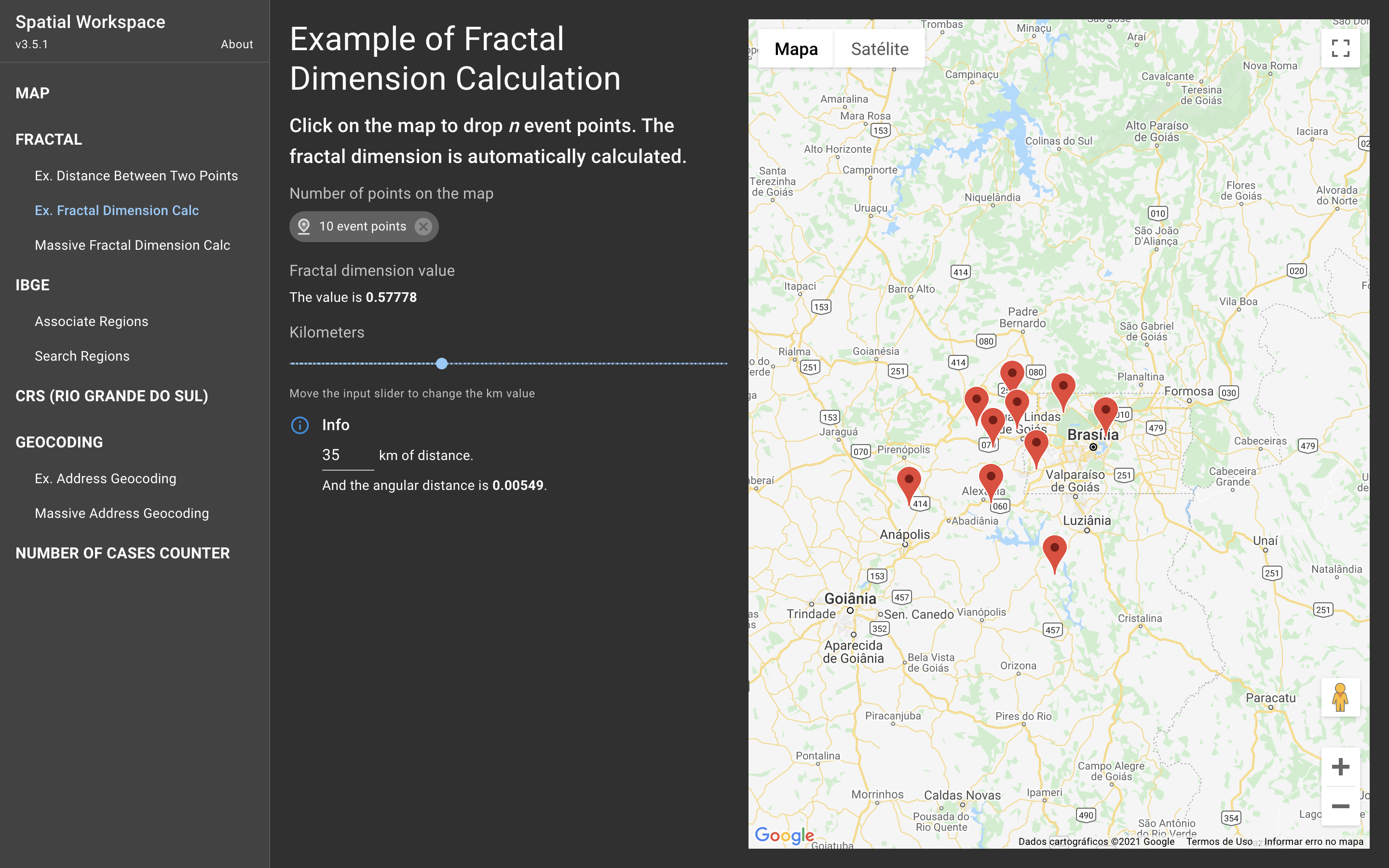 Esta interface exemplifica o cálculo da dimensão fractal entre n pares de eventos. É possível clicar no mapa, a cada click é adicionado um novo evento. Dinamicamente é calculada a dimensão fractal dos eventos sobre o mapa. Também, é possível variar a distância angular entre os eventos no input slider.