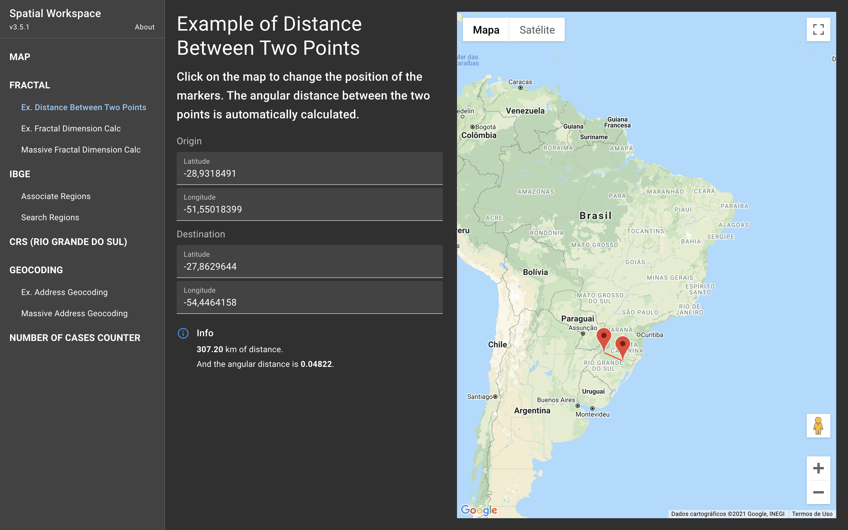 Esta interface exemplifica a distância angular entre 2 eventos. Clicando sobre o mapa é possível alterar o local dos eventos (origem e destino). Automaticamente é calculada a distância angular e em quilômetros entre os eventos.