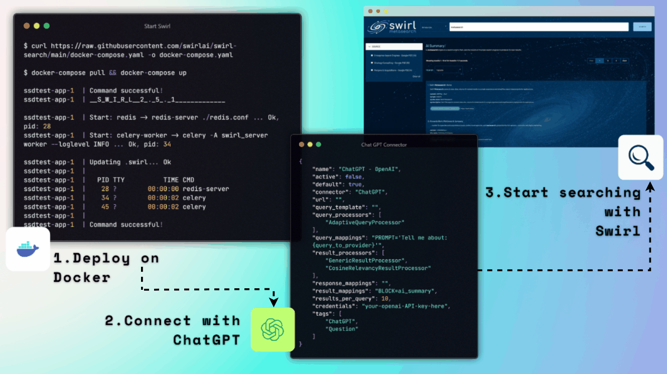 Swirl is as simple as ABC: (a) Download YML, (b) Start in Docker, (c) Search with Swirl. From there, add credentials to preloaded SearchProviders to get results from more sources.