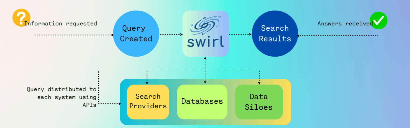 Swirl adapts and distributes user queries to anything with a search API - search engines, databases, noSQL engines, cloud/SaaS services, data siloes, etc. and uses Large Language Models to re-rank the unified results without extracting or indexing anything.