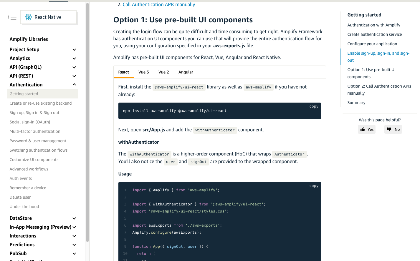 Need to update the instructions for using pre-built UI components for RN. Currently, it shows the instructions for the pre-built UI components for web platforms. Until we get the new Authenticator for RN, we should show instructions for setting up the old Authenticator. |