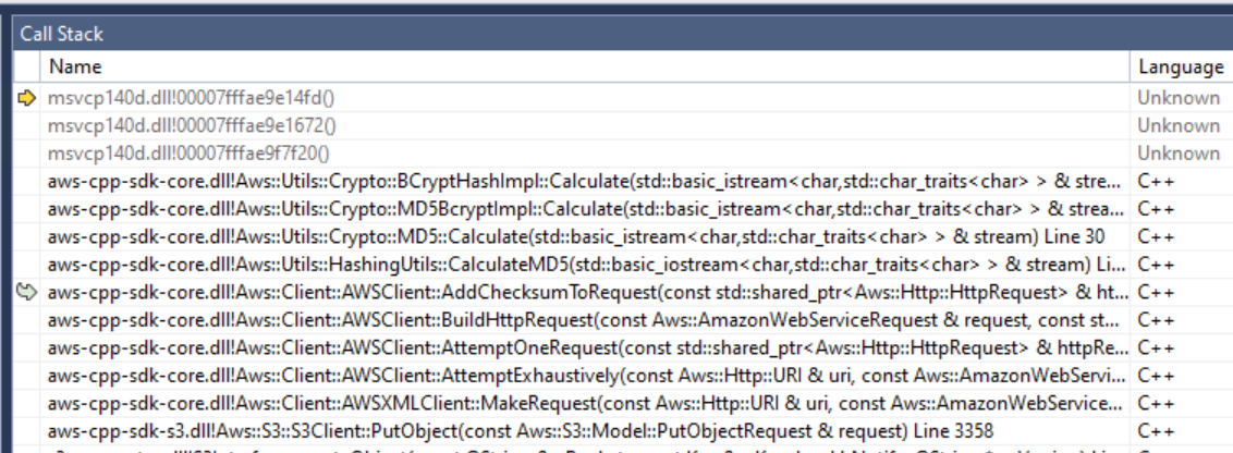 The code above now crashes in the SDK in aws-sdk-cpp-1.9.280-build\aws-sdk-cpp-1.9.280\aws-cpp-sdk-core\source\utils\crypto\bcrypt\CryptoImpl.cpp, line 351 because the struct 'stream' is NULL. It's NULL I think because I haven't set a body on the request as I want to create a 0 byte object in S3. This means that in aws-sdk-cpp-1.9.280\aws-cpp-sdk-core\source\client\AWSClient.cpp line 710 the stream value being passed into this code is NULL: