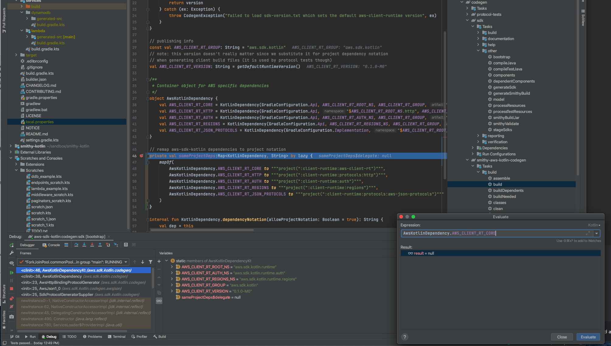 Debug screenshot at the time the map is initialized, you can see the expression for AwsKotlinDependency.AWS_CLIENT_RT_CORE is null at this time.