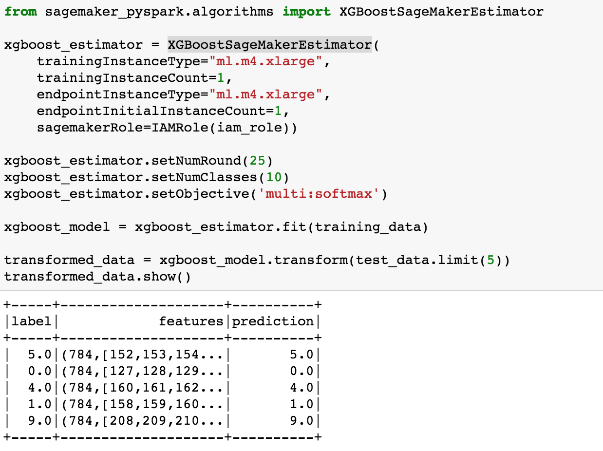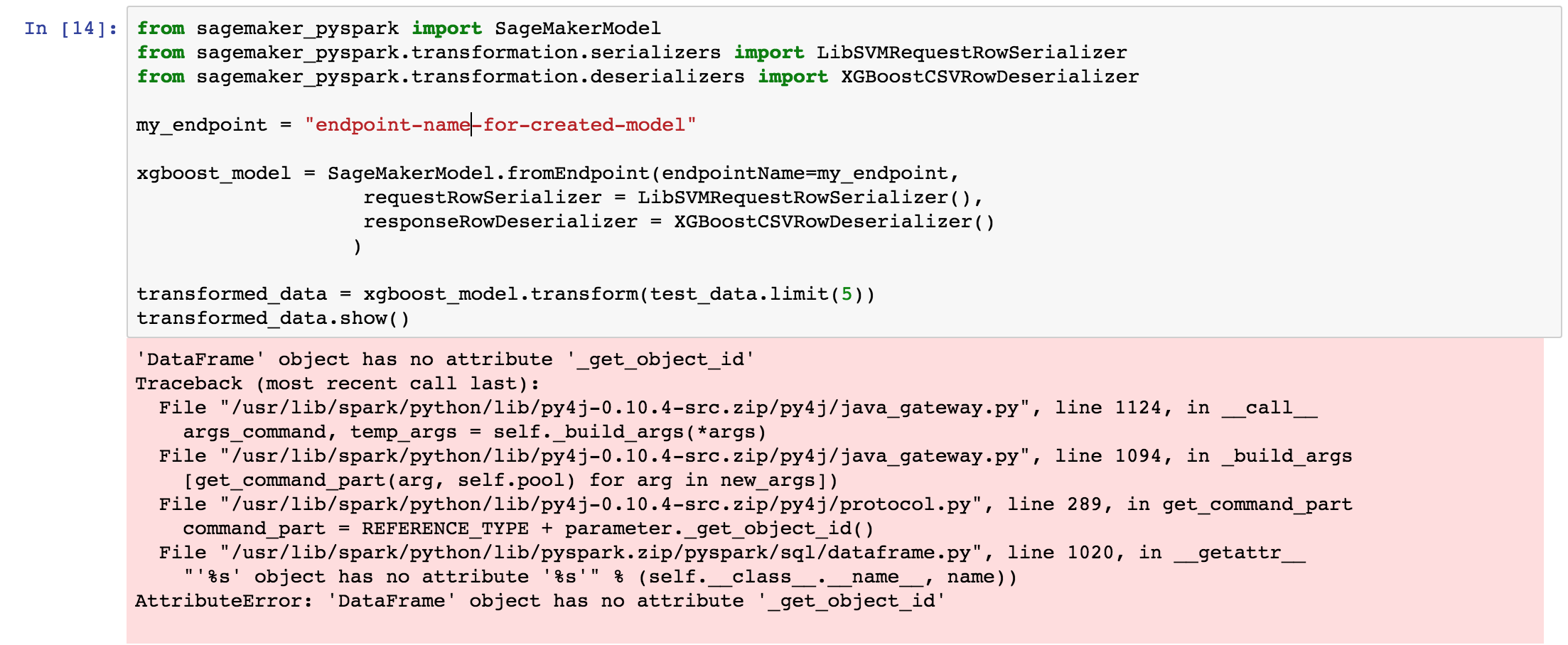 I've trained and deployed an XGBoost model for classifying the MNIST dataset. I can call transform() successfully on my test dataset when I use the model object returned by the XGBoostSageMakerEstimator() constructor, however when I try to useSageMakerModel.fromEndpoint() to create my model object and transform the same dataframe I get the following error:
