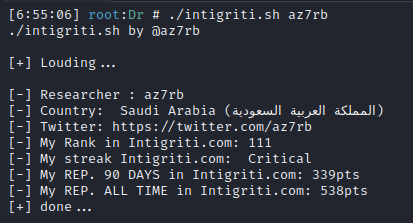 intigriti Usage is pretty simple. Step 1: git clone https://github.com/az7rb/intigriti.git && cd intigriti && chmod +x intigriti.sh Step 2: ./intigriti.sh username