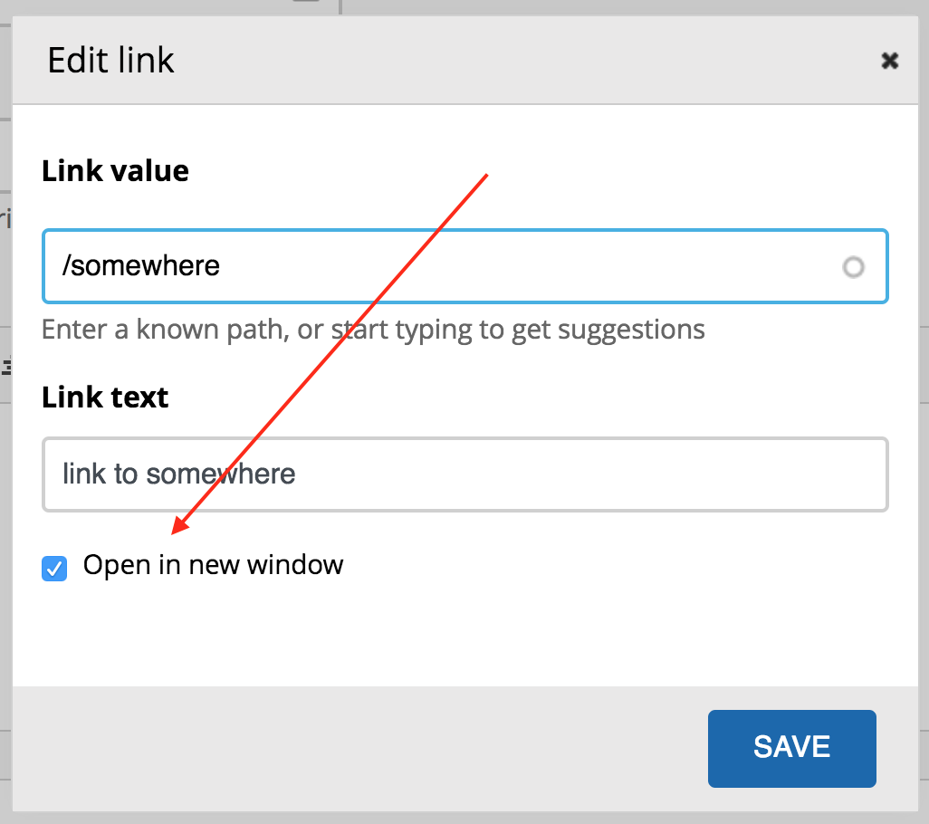 - Add 2 links via the CKEditor, setting one of them to be opening in a new window