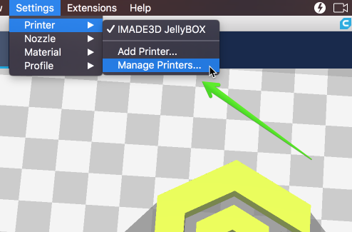 - Start Cura. Go to Settings > Printer > Manage Printers.