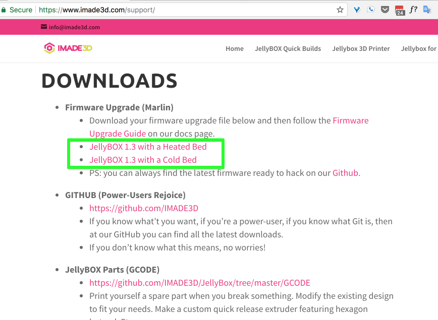 - If you are tech inclined, you can always find the latest firmware ready to hack on our Github. https://github.com/IMADE3D/Marlin/releases