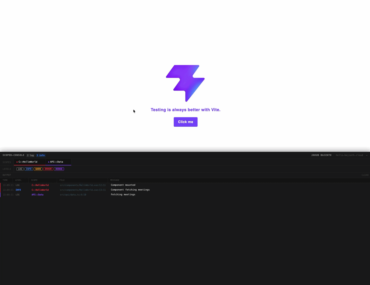 logger.debug('raw payload', data)Logs appear in both DevTools and the in-page panel, tagged with the scope name.